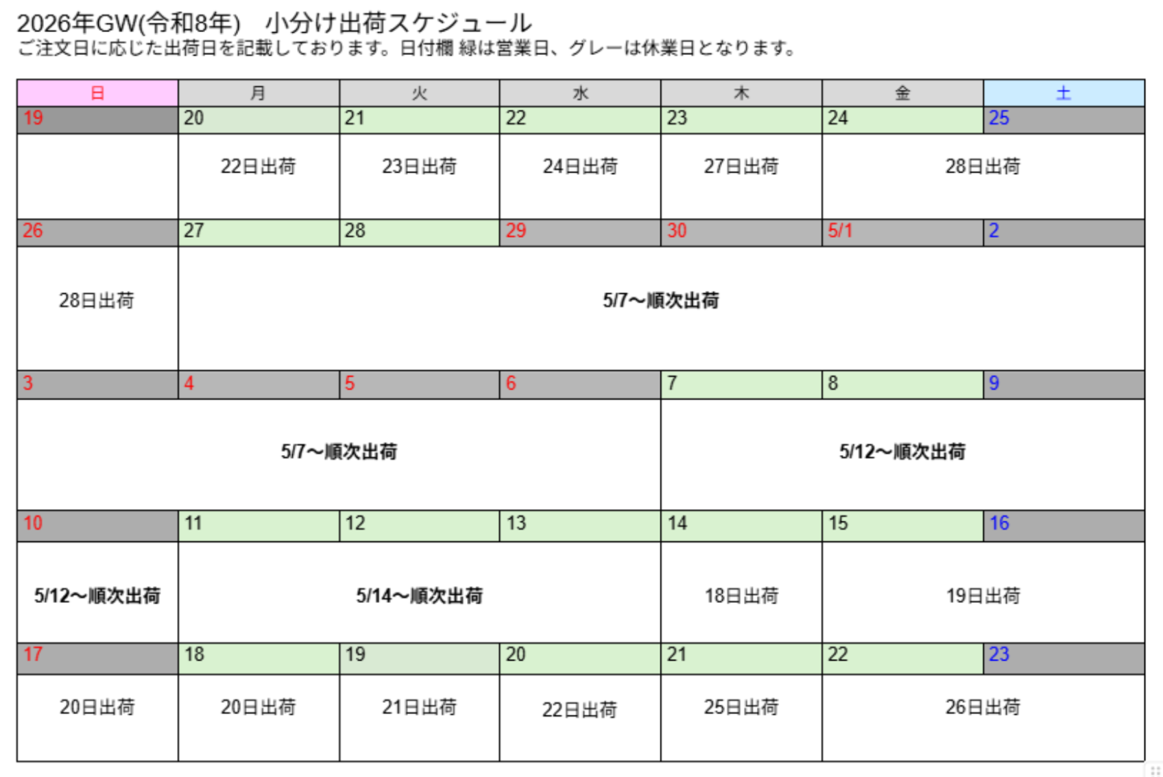 News 【重要】2026年GW期間中の出荷休止および配送スケジュールのご案内