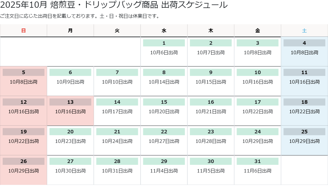 ※焙煎豆・ドリップバッグ以外の加工品は、「生豆の小分け(1kgなど)」のスケジュールが適用されます。