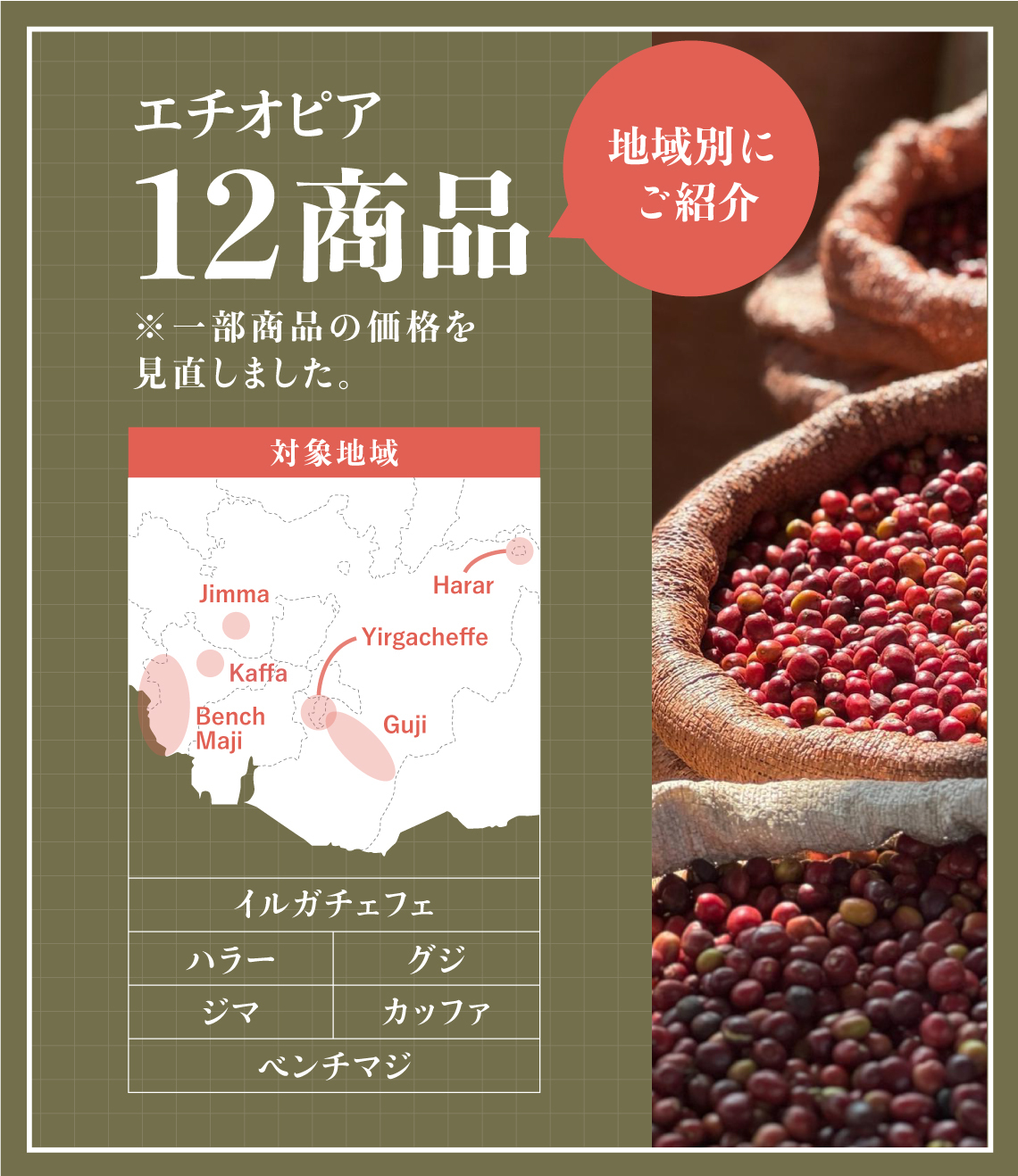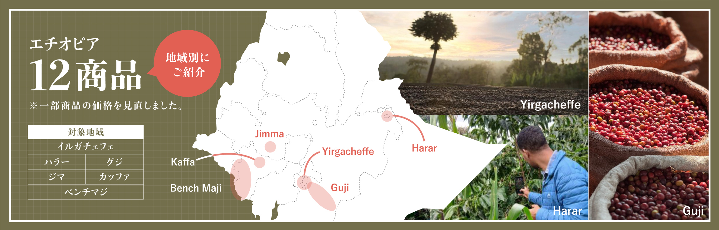 現在お取り扱いがあるエチオピアの12商品をエリア別にご紹介します。
