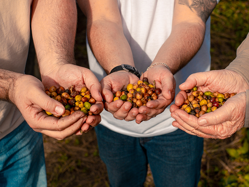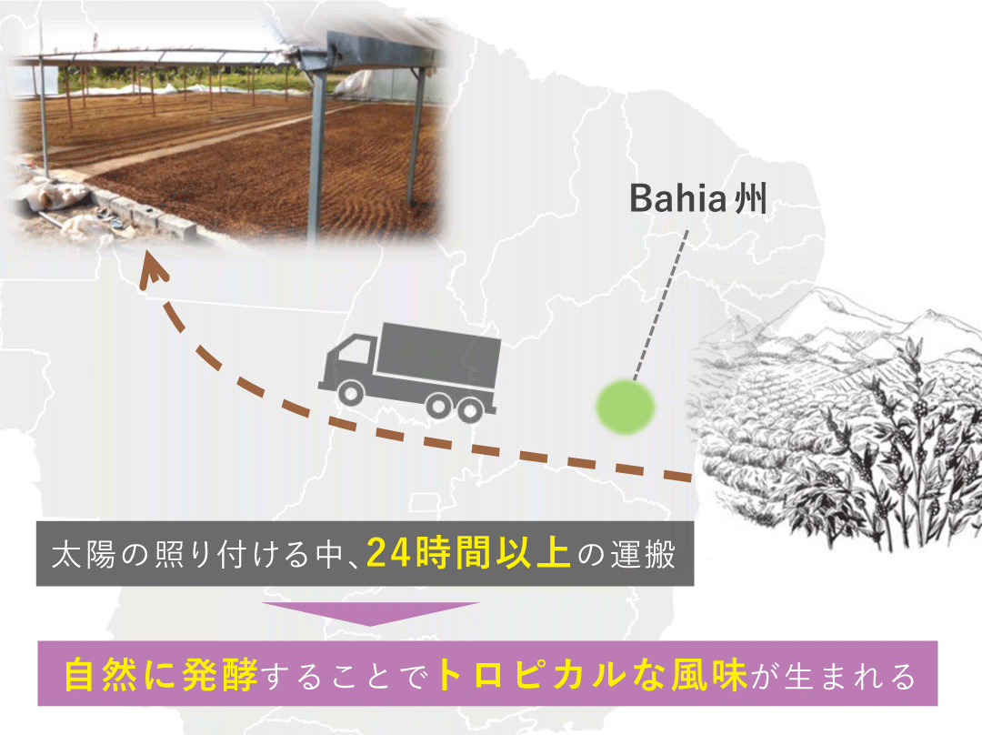ブラジル東海岸に接するバイーア地方では、標高最高1,200mに達する山間部を中心にコーヒー栽培が行われており、昼夜の寒暖差や豊かな日照、肥沃な土壌といった条件がそろう、国内でも屈指の優良産地として知られています。これらの自然環境は、チェリーの成熟をゆっくりと促し、風味の複雑さや甘さを引き出す理想的な要素となっています。一方で、このロットを育てる地域では、収穫期である5月〜10月にかけて湿度が高く、降雨に見舞われることも多いため、乾燥工程において品質管理が難しいという課題を抱えていました。