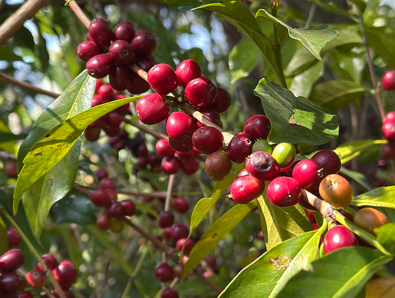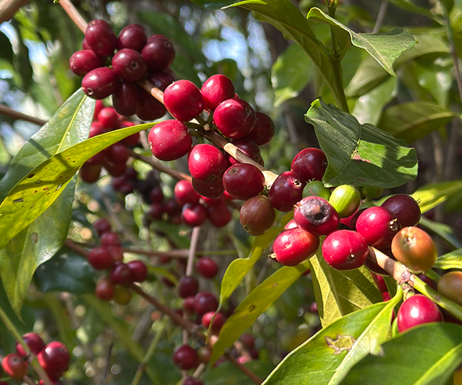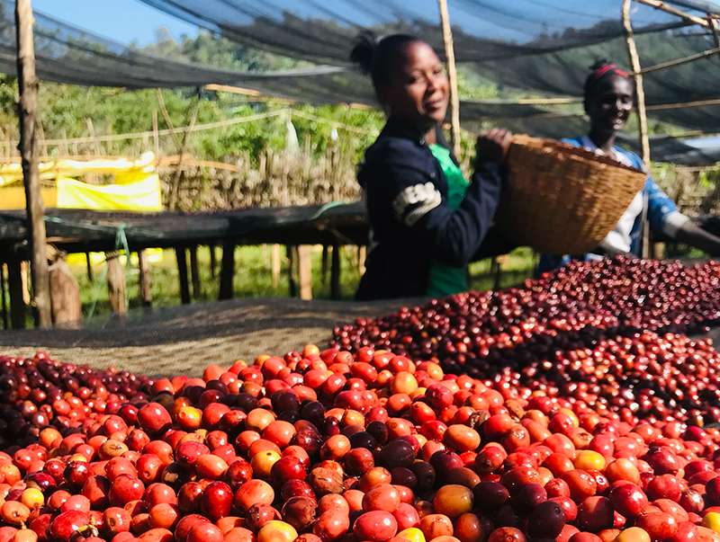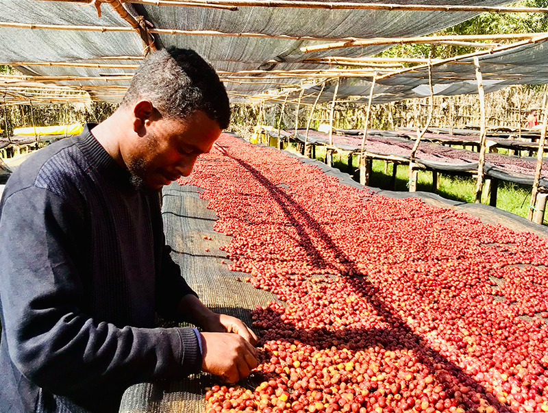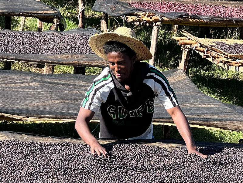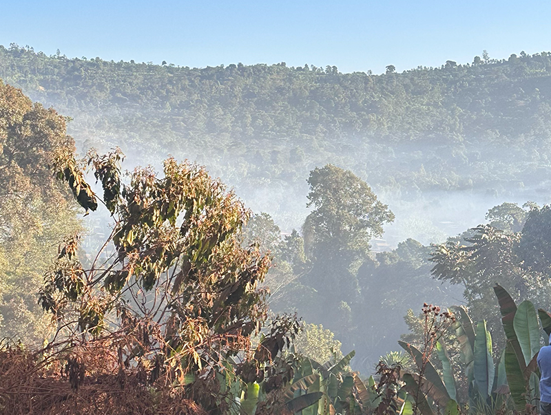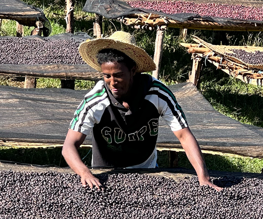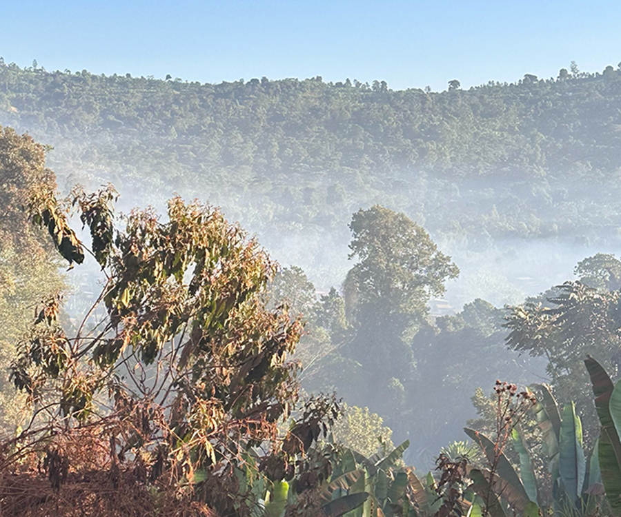 グジは首都アディス・アベバから、イルガチェフェまで南に400km(車で7~8時間)、さらにイルガチェフェから南東80kmあたりへ行ったところに位置します。日中25~6℃、低い時は5℃くらいまで下がります。標高は1,800~2,200m。朝は雲海が広がっており、とても幻想的な光景が広がります。標高が高く寒暖差が大きいため、コーヒーはゆっくりと育ちしっかりと甘さが詰まっていきます。芳醇でフルーティーな味わいを持ち、香り高いアロマが特徴です。基本的にコーヒーはセミフォレストで育てており、放牧されている牛やヤギがそこら中にいて、土はフカフカ。