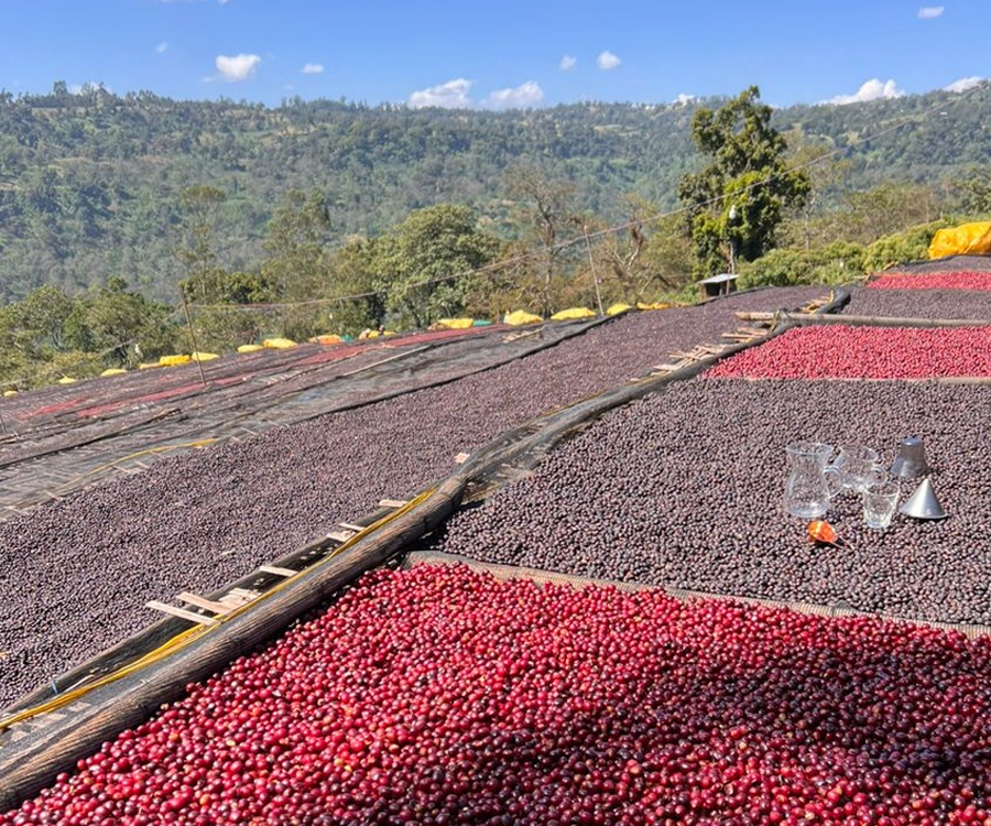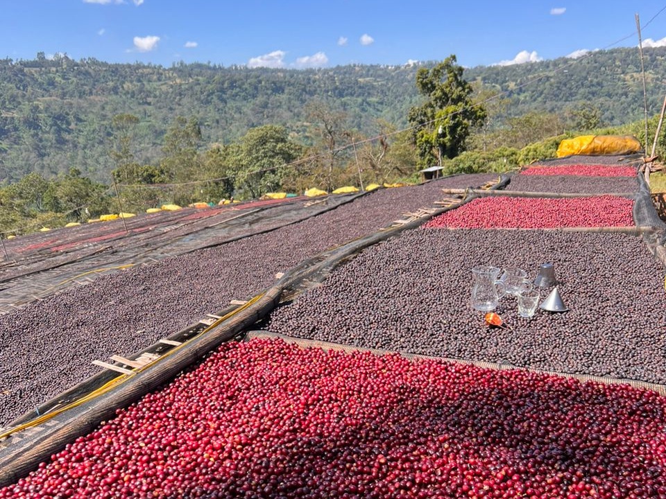 グジは首都アディス・アベバから、イルガチェフェまで南に400km(車で7~8時間)、さらにイルガチェフェから南東80kmあたりへ行ったところに位置します。日中25~6℃、低い時は5℃くらいまで下がります。標高は1,800~2,200m。朝は雲海が広がっており、とても幻想的な光景が広がります。標高が高く寒暖差が大きいため、コーヒーはゆっくりと育ちしっかりと甘さが詰まっていきます。芳醇でフルーティーな味わいを持ち、香り高いアロマが特徴です。基本的にコーヒーはセミフォレストで育てており、放牧されている牛やヤギがそこら中にいて、土はフカフカ。