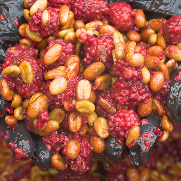 今回紹介するコーヒーは、フルーツを使用した特殊発酵のコーヒーです。果肉除去後、ミューシレージのついたパーチメントの状態で、フルーツを加え、嫌気性発酵を行います。ブラックベリーの場合は48~60時間程度発酵させます。その後、乾燥棚の上で18~25日ほどかけて丁寧に乾燥させています。発酵の時間は、温度や果実の熟度、そして微生物の働きによって変化します。最適な品質を保つために、発酵中はpH値と温度を常にチェックしながら、細やかな管理を行っています。