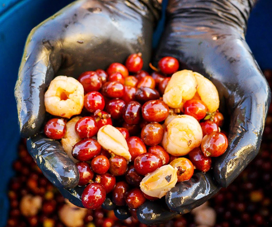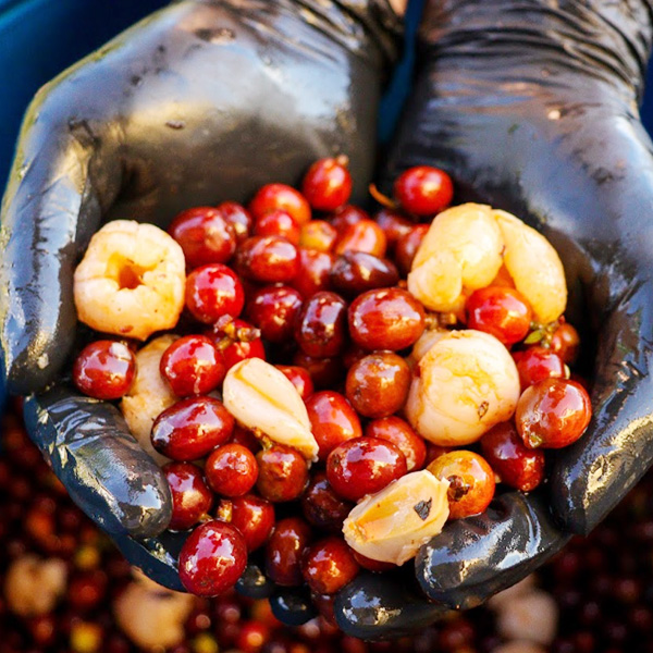 今回紹介するコーヒーは、フルーツを使用した特殊発酵のコーヒーです。果肉除去後、ミューシレージのついたパーチメントの状態で、フルーツを加え、嫌気性発酵を行います。ライチの場合は48~60時間程度発酵させます。その後、乾燥棚の上で18~25日ほどかけて丁寧に乾燥させています。発酵の時間は、温度や果実の熟度、そして微生物の働きによって変化します。最適な品質を保つために、発酵中はpH値と温度を常にチェックしながら、細やかな管理を行っています。