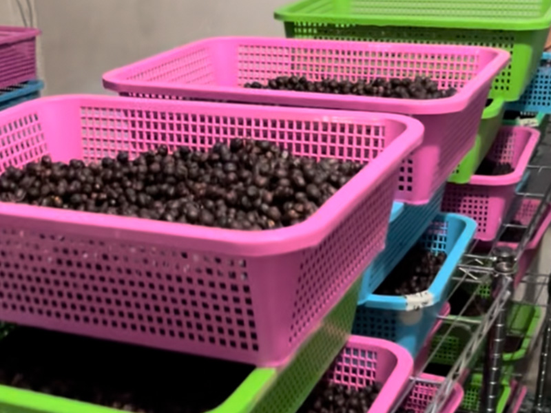 これまでスリさんのロットは家族ロット(ジャイピンファミリー)に含まれ、他のコーヒーと混ぜて輸出されていました。しかし、収穫期にカッピングを行った際、彼女のコーヒーが家族ロットの中でも際立っていると感じました。そのため、昨年から彼女のコーヒーを単独のマイクロロットとして分けて販売しています。 チェリーの状態で48時間嫌気性発酵、その後果肉除去、水洗、ソーキング(水に浸ける)を行います。自作の乾燥用ドームの中で14日間除湿器を使用しながら常に空気を対流させ乾燥させてできたロットです。
