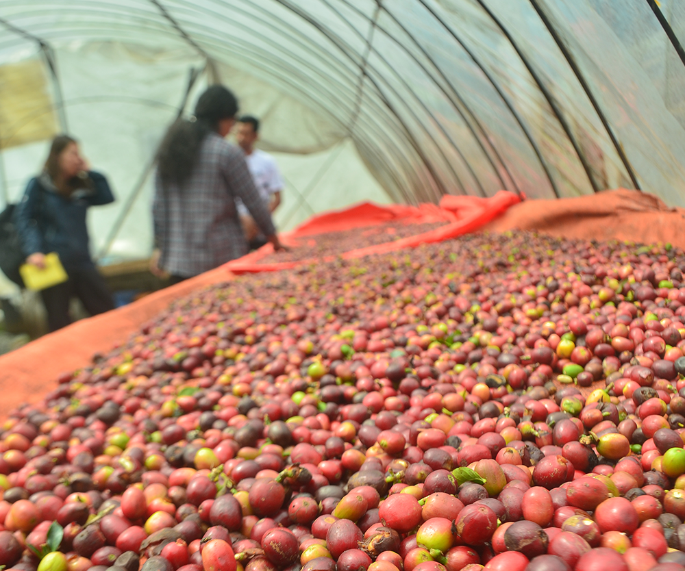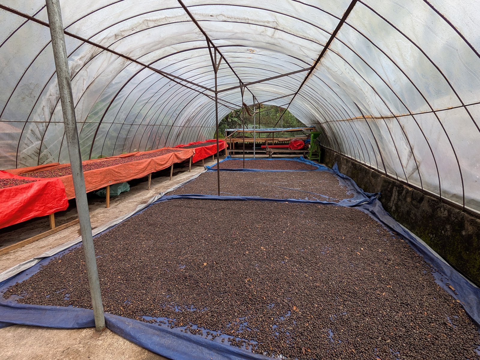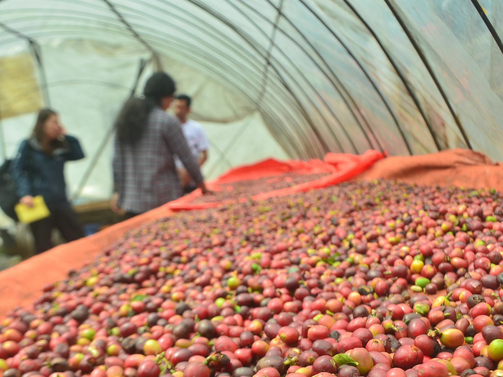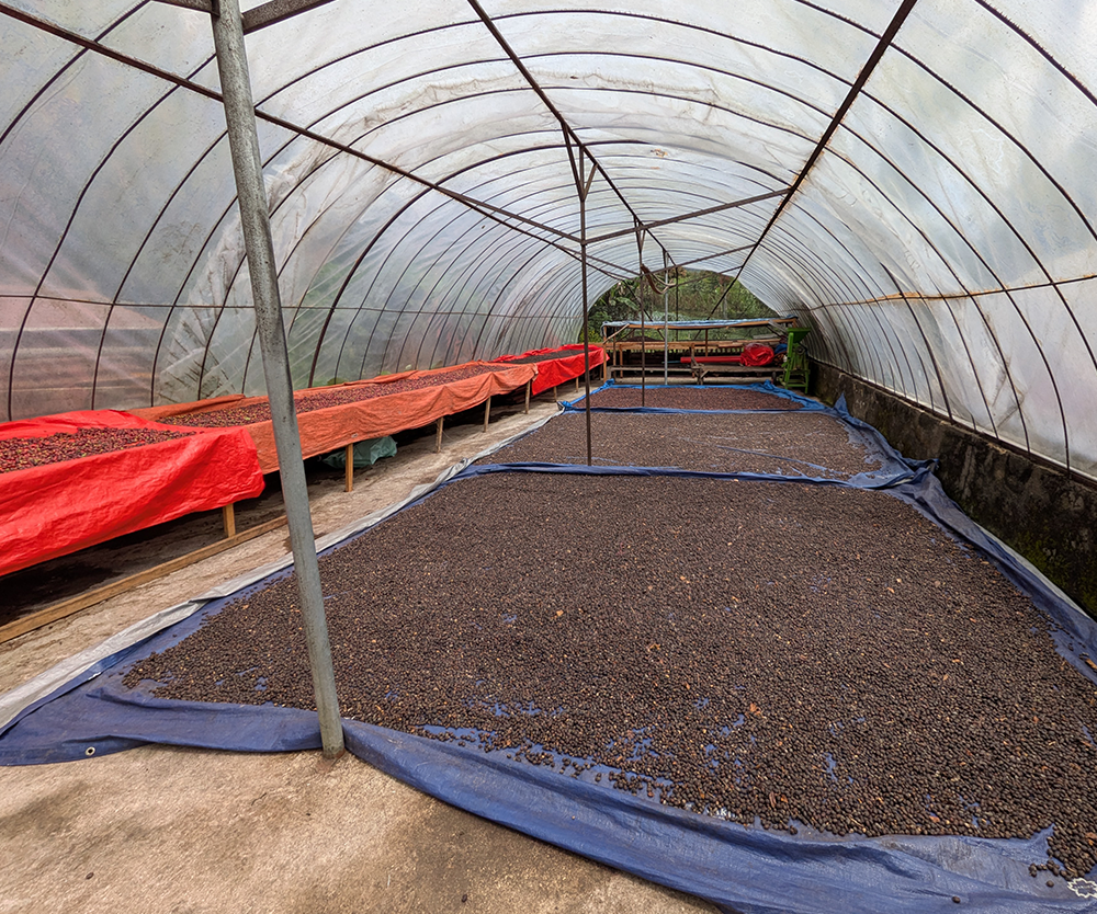 この地域では年間を通してコーヒーの収穫が行われます。 「これはあと2か月後に収穫するもの、これは4か月後、これは9か月後かな……」 同じ1本の木に小さな蕾も、花も、みどりの実も、黄色い実も、もうすぐ収穫を迎える赤い実もなる様子はこの土地ならではの様子です。