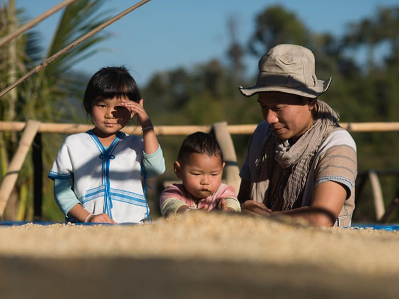 レイジーマンコーヒー代表のスエさんは、タイ北部チェンマイの少数民族カレン族。ノンタオ村で暮らしています。自宅の裏庭には、果実や野菜、薬用植物などが、まるでジャングルのような森の中に自然と共存し、コーヒーの木も植えられています。傍らには、スエさん自身が建てた小さなカフェもあります。「僕はなまけ者なんだ。すぐそこに田んぼがあって、庭にフルーツがなっていて、コーヒーが育ってる。それで十分生きていけちゃうからね」とスエさんは笑います。