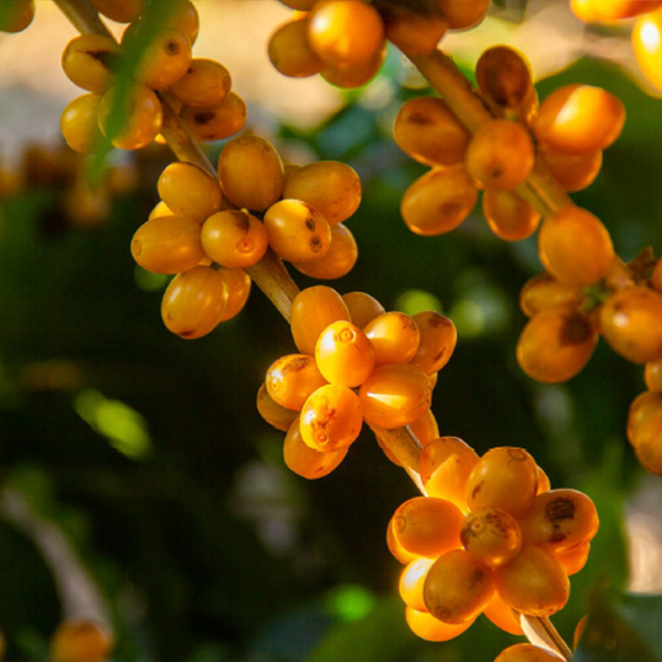 ピーベリーが収穫量全体に占める割合は、約5~20%と言われています。通常コーヒーチェリー(果実)の中には2つの「フラットビーン(平豆)」が入っていますが、稀にそうならない場合があります。2つの種子のうち1つが育たず、もう一粒がその空洞を埋めるように俵状に生長した場合、フラットな面を持たない「ピーベリー(丸豆)」と呼ばれます。今回は、2つの地域で生産されたイエローブルボン種の中から、この希少なピーベリーのみを厳選し、特別に仕上げていただきました。